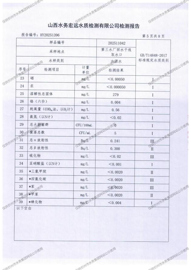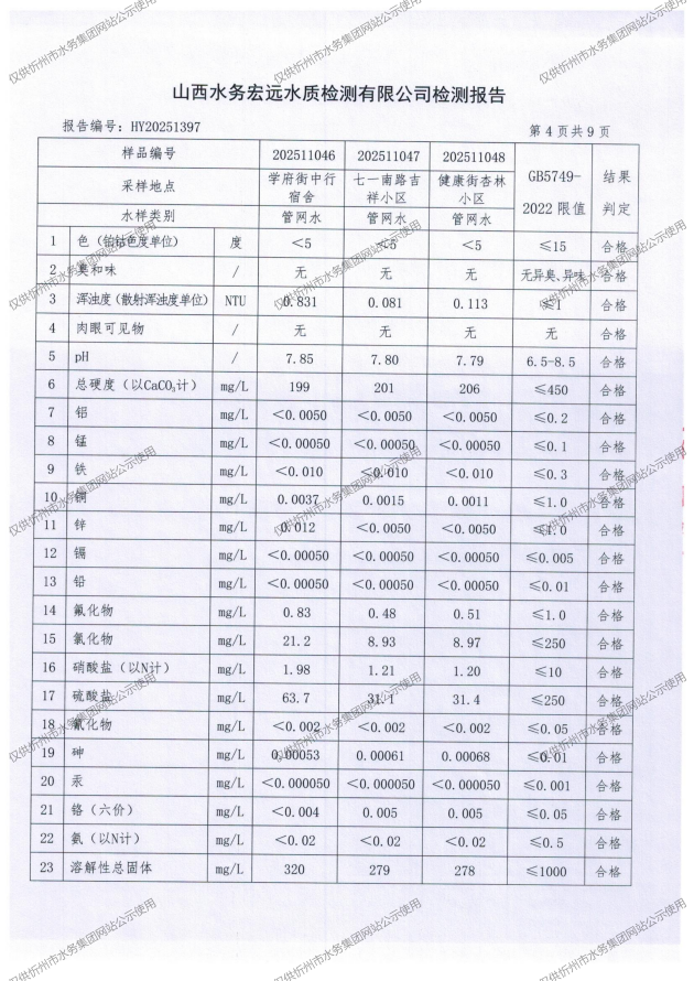 忻州城區(qū)公共供水水源水、出廠水、管網(wǎng)水、管網(wǎng)末梢水2025年11月份水質(zhì)信息公示